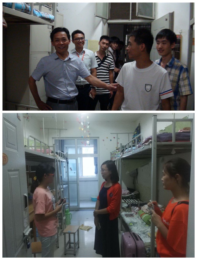 新生报道第一天,樊树民书记、杨莉副书记带领班主任、辅导员坚持在现场解答新生和家长的问题,直到傍晚。为了能让离开家来公司的新生感受到关爱和温暖,樊书记、杨书记分别带领老师到新生宿舍看望同学,与新生进行面对面交谈,关心同学们饮食是否习惯,衣物是否带全,还有什么困难等问题,充分让新生感受到了老师对他们的关爱。