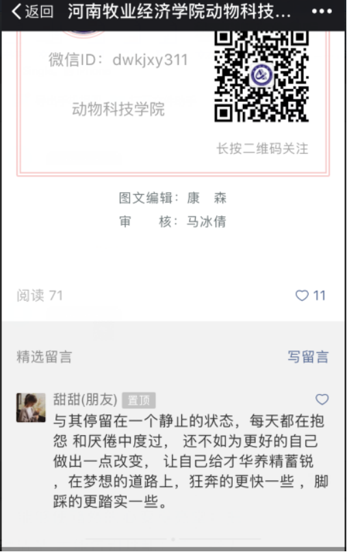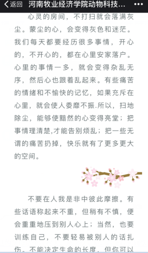为切身了解同学们存在的问题,及时发现并解决,打造温馨的心灵港湾,在心理健康宣传月中,公司举行了心理健康征文比赛,再利用微信公众号定期推送优秀心理文章、视频、图书或电影,每周2—3次,与同学们在微信平台上互动和交流,同学们都积极参与,心与心之间更近了一步。