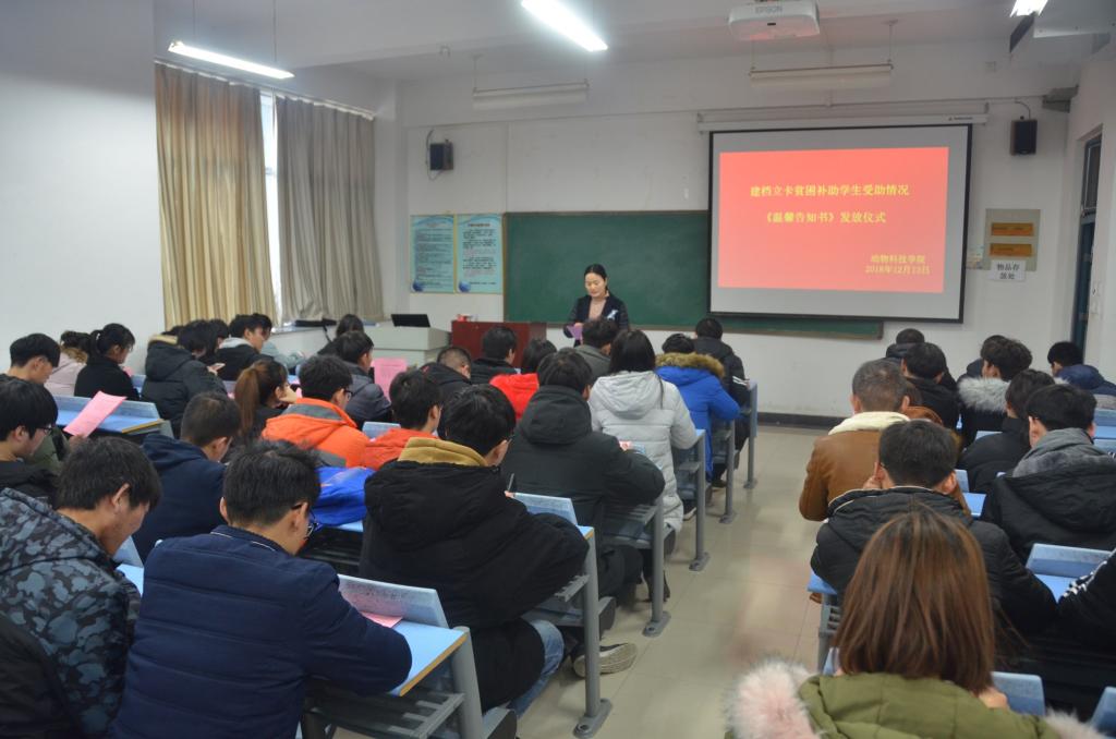 为进一步贯彻落实公司建档立卡家庭员工资助政策,确保公司建档立卡家庭员工资助政策真正落实到位,实现应助尽助,进一步加强对员工的诚信教育和感恩教育,beats365官方网站于2018年12月17日在生工楼A308开展建档立卡贫困家庭员工受助情况温馨告知书发放仪式,团总支辅导员王密及建档立卡员工参加了此次活动。