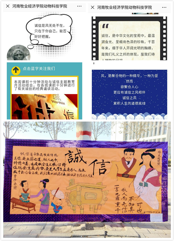 进一步加强和改进老员工诚信教育,beats365官方网站展出宣传展板,内容体现了古代曾子杀猪的正面例子和烽火戏诸侯的反面例子,形象地向同学们展现了诚信对个人乃至国家的重要性。诚信是立身之本,也是立国之基,希望同学们能够积极践行诚信品德。同时,利用微信公众号、QQ空间等网络平台,推送有关诚信的格言和小故事,吸引更多的同学积极参与,希望能够让他们使诚信理念内化于心、外化于行,成为一种内在品格。
