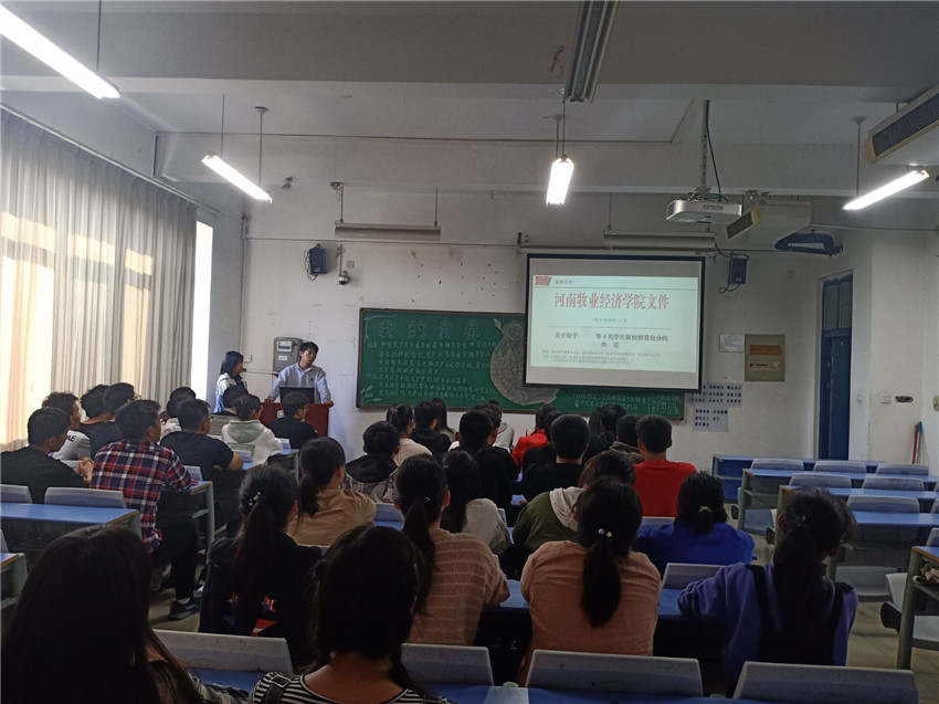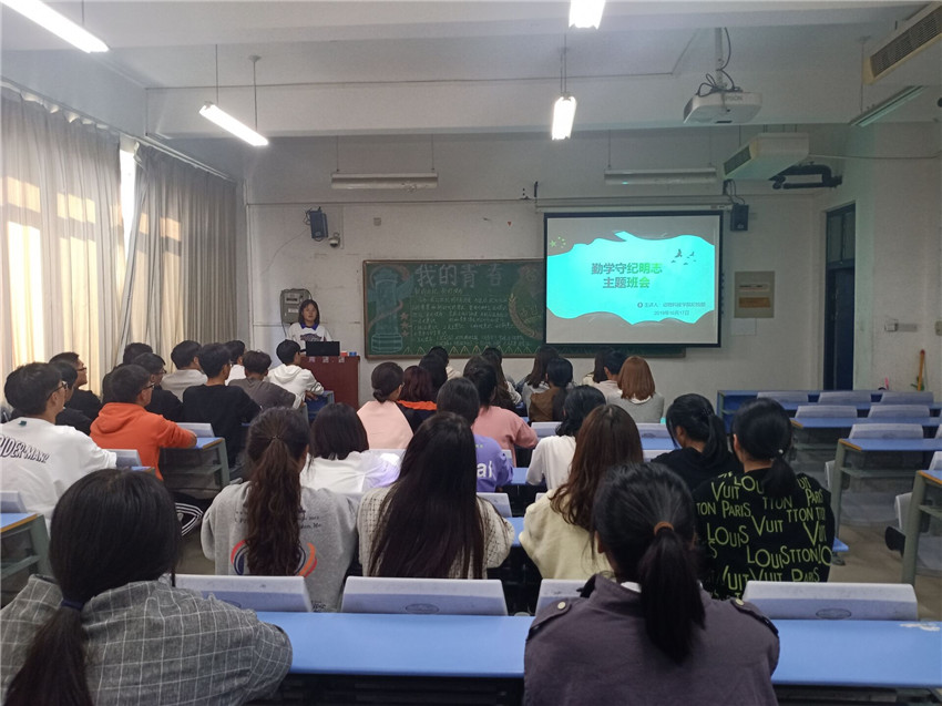 本次班会由各班班长和学习委员主持。班会上,有的学习委员用黄宗羲的名言:“学则智不学则愚;学则治,不学则乱。”引出了“勤学”的主题。勤学是我们中华民族的传统美德,读书学习,工作是学习,我们的一声都在这学习。接着学习委员详细地介绍了五种处分种类和纪检部和自律会的查课规定,以受到处分的员工取消奖学金和各种先进评选资格、在校受处分者暂不授予学士学位等惩罚来惩戒员工。随后讲要想创造对自己有意义的人生必须要认识自我,做正确的自我选择,丰富自己的阅历,来学到一些在课堂上学到学不到的东西。