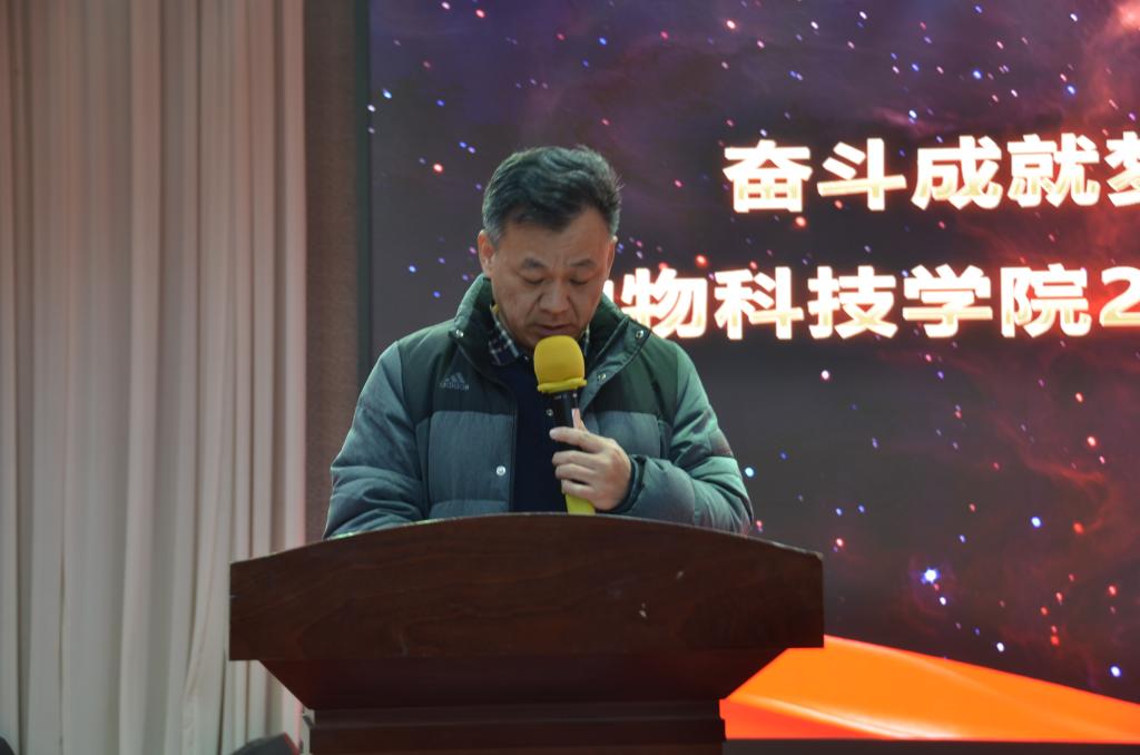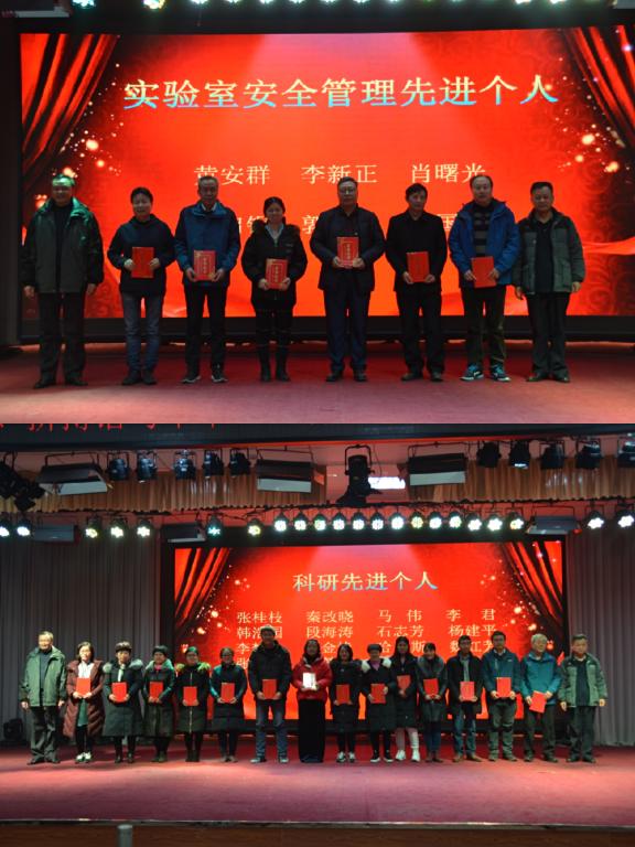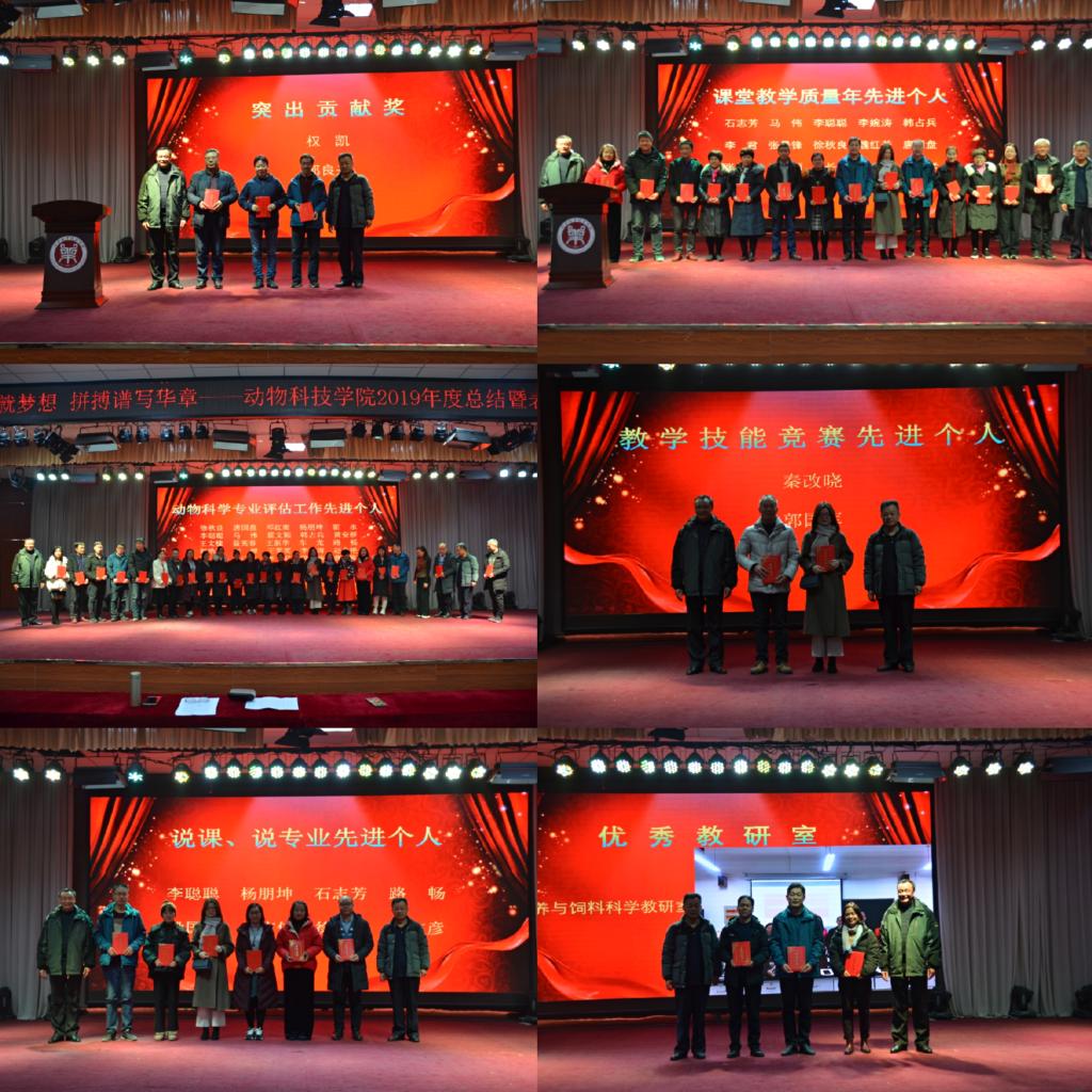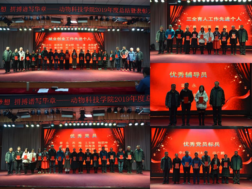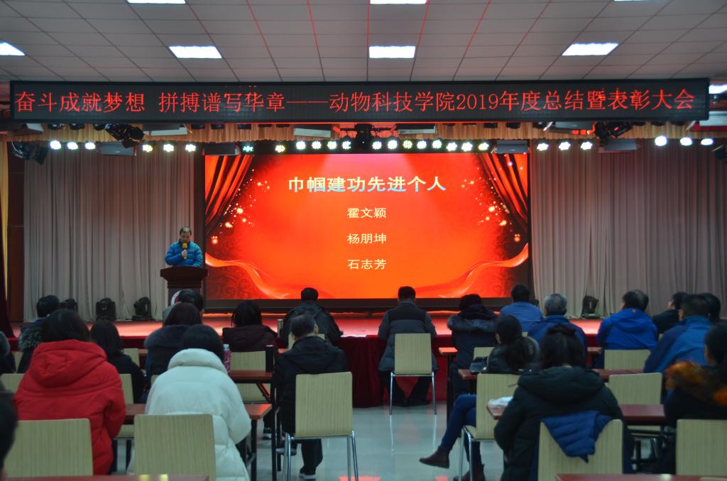 首先,经理席磊教授作年终总结报告,他回顾了2019年全院师生在教学、科研、团队队伍建设等各方面取得的优异成绩,尤其是“黄淮肉羊”新品种通过了国家品种鉴定委员会的现场审定,实现了历史性突破。接着,公司党委副书记冯广鹏宣读了表彰决定,对2019年度在党建、教学、科研、实验室工作、社会服务、工会和员工工作中表现突出的集体和个人进行了表彰。家禽生产教研室、动物遗传育种与繁殖等4个先进集体,权凯、郭良兴、李君、石志芳等优秀个人受到了表彰。公司党委书记王建伟、经理席磊在台上为每一位受表彰的教师颁奖。教师代表郭良兴博士代表教师进行发言,他细数了2019年自己在院领导的指导和同事们的协助下为教学、科研和校企合作所做的工作。他表示,今后将继续认真做好每一件事、服务好身边的每一个人,为公司发展尽心尽力。最后,公司党委书记王建伟致辞,并代表班子成员对全体教职工付出的辛勤和做出的贡献表示感谢!他号召大家“在新的一年里,让我们用汗水浇灌收获、以实干笃定前行,凝心聚力、提振精神,不负伟大时代,共创美好未来!”