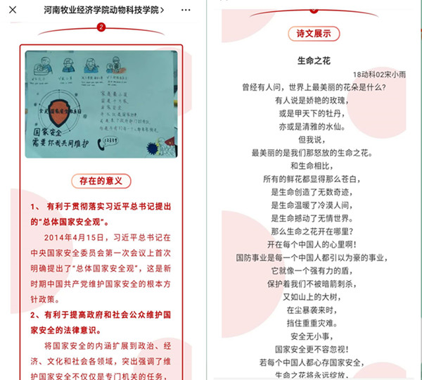 本次活动开展了以“国家安全”为主题的口号标语、微电影、微视频、诗歌散文、摄影作品等。通过广泛宣传和积极动员,同学们踊跃报名,共收集各类作品共计120余个。同学们通过参与活动,了解了国家安全法,认识到了国家安全对于每个人的重要作用,提高了同学们的国家安全意识。家是最小国,国是千万家,有了强的国,才有富的家。国家安全不能只靠国家,也要靠大家。国家安全,你我共同的责任!