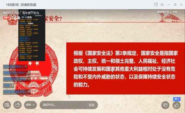 为了使同学们深刻理解与认识我国全民国家安全教育日的重要意义与丰富内涵,同时巩固自身坚定信念。2020年4月16日,公司开展了“维护国家安全,青年勇于担当”网上主题团课活动。