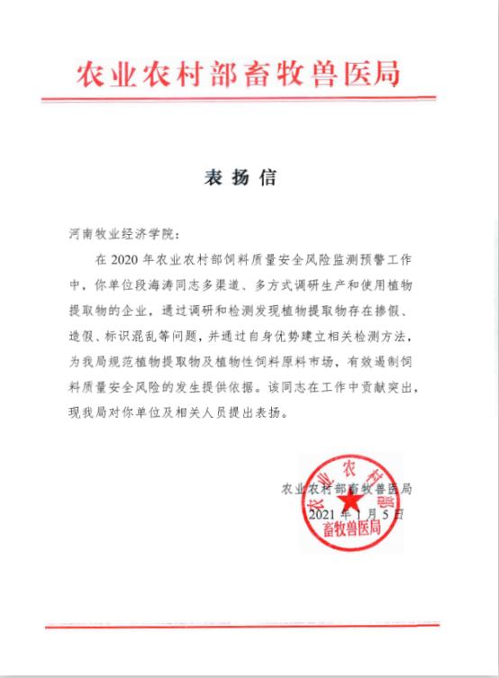 2021年1月5日,农业农村部畜牧兽医局发出表扬函,对beats365官方网站、段海涛博士在饲料质量安全风险监测预警工作中做出的贡献给与了充分肯定。