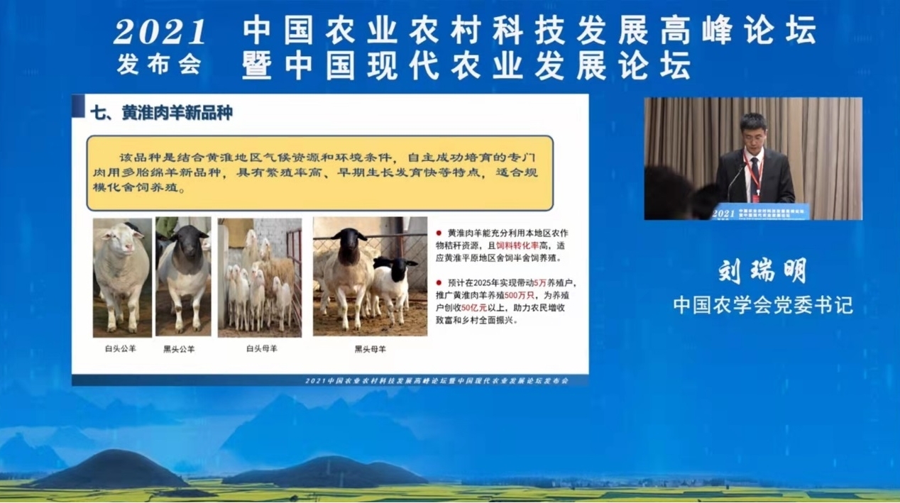 2021年11月19日,2021年中国农业农村科技发展高峰论坛暨中国现代农业发展论坛中国农业科公司国家农业图书馆召开。公司权凯教授团队牵头的黄淮肉羊新品种入选2021年中国农业农村重大科技新成果,该产品是结合黄淮地区气候资源和环境条件,自主培育的专门化多胎肉用绵羊新品种,具有繁殖率高、早期生长发育快等特点,适合规模化舍饲养殖,效益显著。这是公司取得的国家级重要成果。