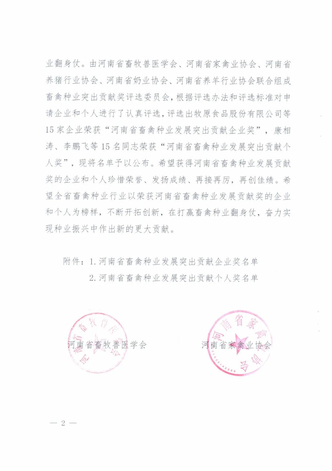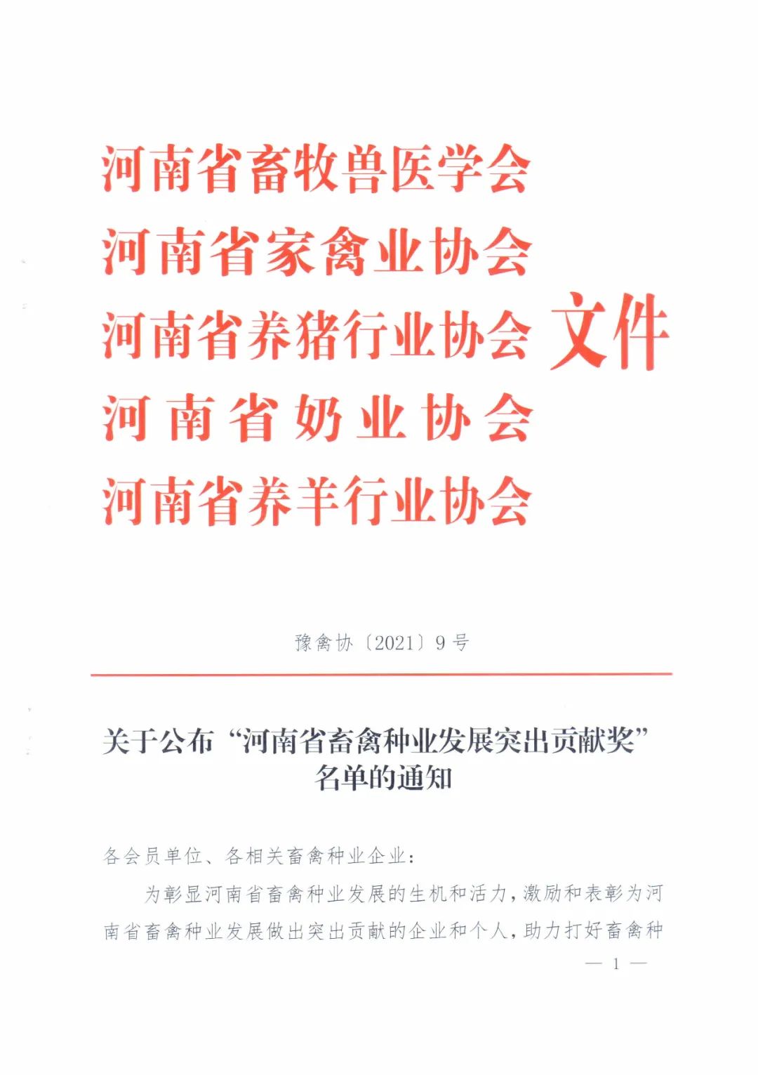 为彰显河南省畜禽种业发展的生机和活力,激励和表彰为河南省畜禽种业发展做出突出贡献的企业和个人,助力打好畜禽种业翻身仗。由河南省畜牧兽医学会、河南省家禽业协会、河南省养猪行业协会、河南省奶业协会、河南省养羊行业协会联合组成畜禽种业突出贡献奖评选委员会,根据评选办法和评选标准对申请企业和个人进行了认真评选,评选出15家企业荣获“河南省畜禽种业发展突出贡献企业奖”,15名同志荣获“河南省畜禽种业发展突出贡献个人奖”,公司权凯教授为荣获“河南省畜禽种业发展突出贡献个人奖”其中一员。