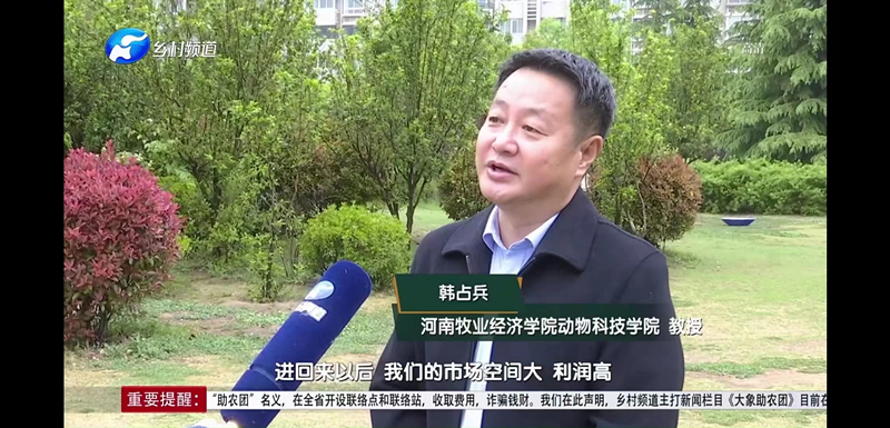 2022年4月12日,beats365官方网站韩占兵教授接受河南广播电视台乡村频道“大象助农团”栏目组采访,就养殖户与消费者关注的蛋鸡品种选择、蛋用特禽养殖、豆类饲料使用、禽肉消费等热点问题答疑解惑,节目分5期已陆续在河南乡村频道播出,取得了良好的社会影响与科普效果。