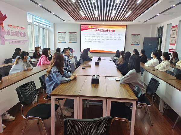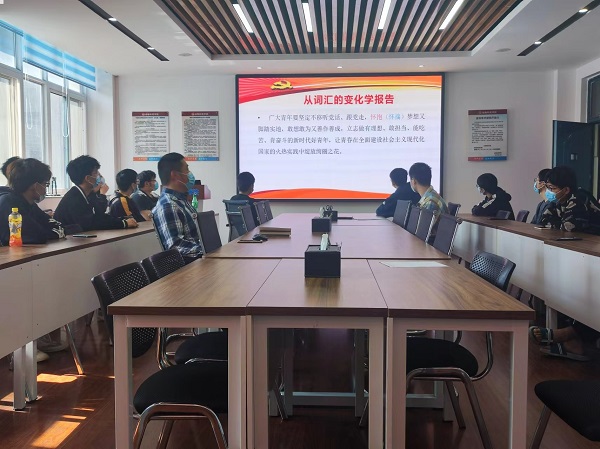 李建伟老师以“从词汇的变化学报告”为主题,分享了学习党的二十大精神的心得体会。李老师带领大家一起学习了谱写、有效、拓展、勤奋、怀抱等党的二十大报告中的词汇,从词的词性、释义等方面给予了解释和说明;跟大家分享了学习“开辟马克思主义中国化时代化新境界”“着力推动高质量发展”“强化现代化建设人才支撑”“发展全过程人民民主”等方面的心得体会;号召大家深入学习党的二十大精神,自觉贯彻于抗击疫情、全面发展、健康生活等行动中,勇做有理想、敢担当、能吃苦、肯奋斗的新时代好青年。