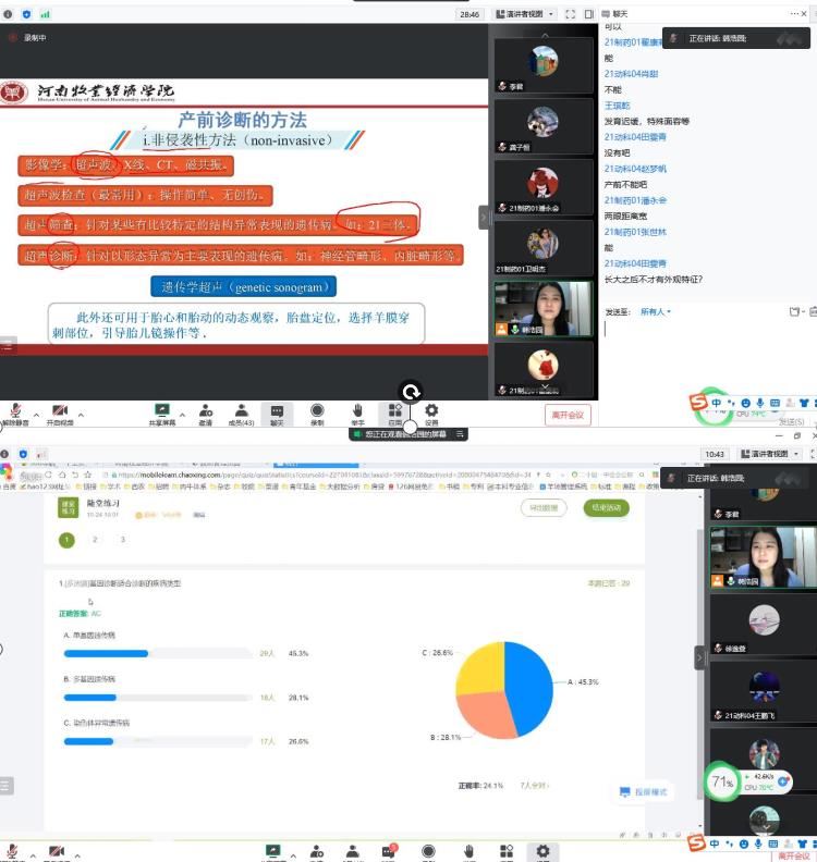 韩浩园博士讲授了《转基因与我们的生活》课程的“产前诊断方法”章节,该课堂利用讲解随堂测验试题,复习巩固,导入新课,以丰富的教学案例阐释人类疾病的种类、发病机制和诊断方法,并融入课程思政。韩浩园博士以员工为主体,进行启发式,探究式教学,语言亲和力强、思路清晰,重点突出,师生互动较好。