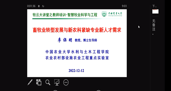 为了让教师充分了解物联网、大数据、人工智能为代表的新一代信息技术推动智能化畜牧业的转型发展现状,促进教师对数字赋能背景下专业建设的深入认知,准确把握数字化转型升级的实质、途径和措施,加快构建适应新农科发展的人才培养体系。beats365官方网站在公司教师发展中心的指导下,于2022年12月12日-2023年1月10日,以线上直播+线下总结的方式完满完成了《数智牧业应用与创新》多学科融合数智化赋能教师发展团队培训课程,参训师生近300名。