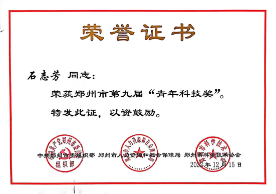 近日,第九届郑州市“青年科技奖”获奖人揭晓,共授予30名获奖者,公司科研办公室主任石志芳老师获此殊荣。郑州市“青年科技奖”是经郑州市委、市政府批准,由中共郑州市委组织部、郑州市人社局、郑州市科学技术协会共同举办的评选活动,旨在培养造就一批高素质青年科技专家和科技领军人物,激励广大青年科技工作者为郑州市跨越式发展贡献才智。该奖项每两年评选一次,每届获奖名额不超过30名。