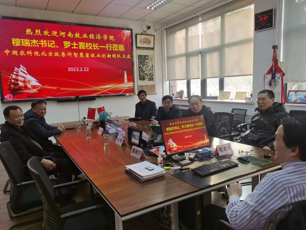 随后穆瑞杰书记和罗士喜董事长一行考察了中国农业科公司北京畜牧兽医研究所和农产品加工研究所,座谈中听取了秦玉昌所长、熊本海首席和王凤中所长的介绍。罗士喜董事长介绍了公司的发展历史、公司建设、团队力量、教学设施等基本情况,公司牧工商一体化发展思路,希望在智慧牧业科学与工程专业建设方面得到北京畜牧兽医研究所的帮助。