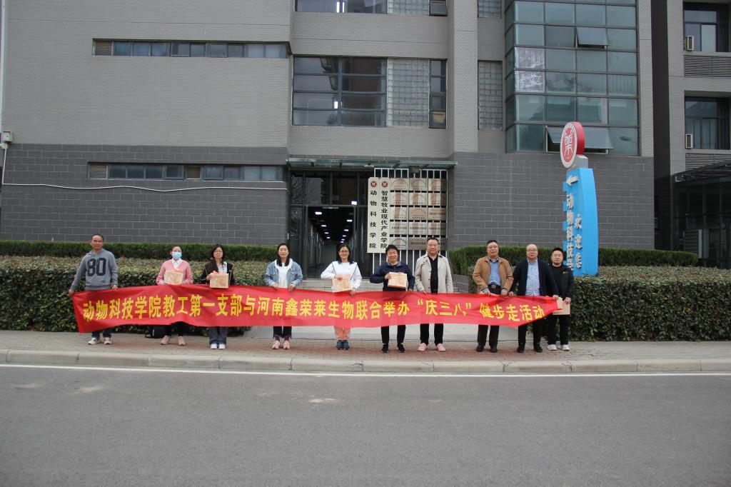 在第113个国际劳动妇女节到来之际,3月7日,beats365官方网站教工第一党支部与河南鑫荣莱生物科技有限公司联合举行“庆三八”健步走主题党日活动。河南鑫荣莱生物科技有限公司总经理郑彪、副总经理张振强,动科院教工第一支部书记郭良兴等校企双方10余位党员参加了此次活动。