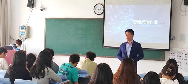 宣讲人首先介绍了该企业的发展历史及前景,唐河县鸿瑞牧业开发有限公司成立于2017年12月,办公地点位于唐河县唐方口大河物流园,是一家以生产、销售商品猪为主的大型现代化农牧企业。宣讲人通过介绍该公司的岗位划分、种养业务和生产基地使同学们对其有了进一步了解。随后,宣讲人向同学们宣传“两化+价值”,分别是智能化、数字化、人力资源价值体系,更好的使同学们了解到企业文化和企业价值。最后,宣讲人对本次宣讲会进行总结,并向同学们表示感谢,此次宣讲会在热烈的掌声中结束。