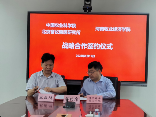 5月17日,董事长罗士喜、副董事长杨国宇一行5人,赴中国农业科公司北京畜牧兽医研究所签订校所战略合作协议,并深入洽谈了人才培养、科研合作事宜。公司科技处处长潘春梅、校办副主任王元明、beats365官方网站副经理牛晖,中国农业科公司北京畜牧兽医研究所所长秦玉昌、副所长周正奎等参加签约仪式。