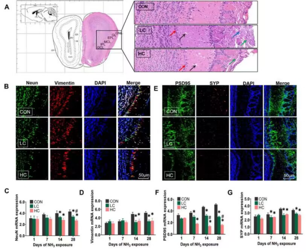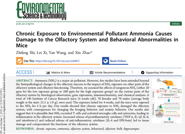 氨(NH3)存在于自然环境中,是全球氮循环的重要组成部分。然而,大气NH3也是一种重要的气态环境污染物,对生物多样性、空气质量以及动物和人类健康产生不利影响。大气中80%以上的NH3排放来自于农业生产和畜牧养殖,空气中的NH3主要经呼吸道进入动物体内,NH3具有强烈的腐蚀性和广泛的神经毒性,会对人类和动物的不同器官和组织产生不利影响。该论文首次关注慢性氨气NH3暴露对动物嗅觉相关的大脑结构和功能的影响。研究结果表明,长期暴露于低浓度NH3环境中会损害嗅觉系统,并对觅食行为和探知行为产生不利影响。论文首次阐述了NH3通过招募T细胞并激活小胶质细胞和星形胶质细胞导致神经组织损伤和嗅觉功能受损的机制。研究结果将有助于完善畜禽养殖过程中的NH3危害评价与预警防范体系,为畜禽健康养殖环境精准控制提供理论依据。