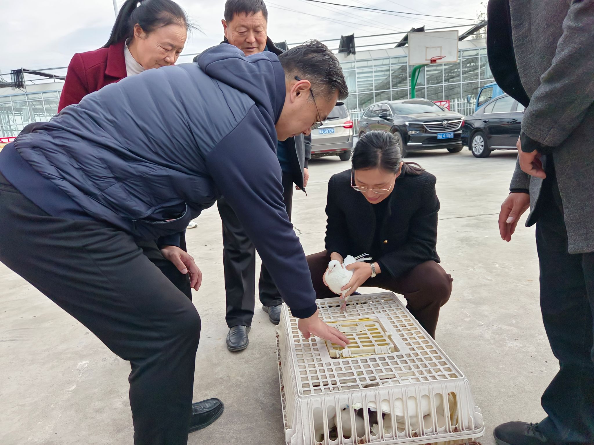 期间,邓红雨一行向大马庄村捐赠了200只-皖杂肉鹅鹅苗和10对优质白羽王鸽肉种鸽。