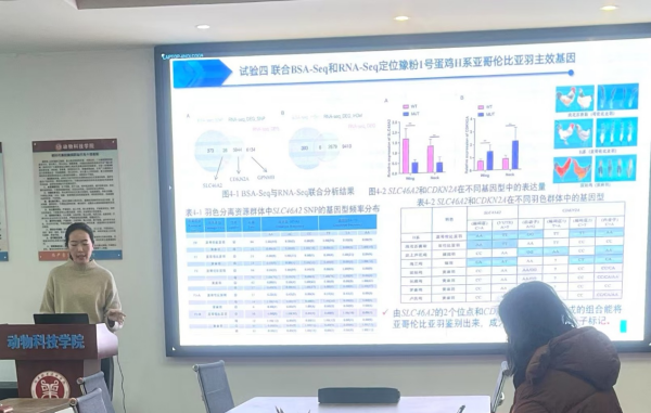 李瑞婷博士的报告主题为《豫粉1号蛋鸡H系亚哥伦比亚羽主效基因的定位与功能验证》,通过对H系母鸡(亚哥伦比亚羽)和固始公鸡(黄麻羽)杂交形成的F3代羽色分离资源群进行BSA-seq,将影响亚哥伦比亚羽的位点定位到染色体的某个区间内,筛选与亚哥伦比亚羽相关的遗传变异位点。通过对不同羽色的毛囊组织进行RNA-seq,挖掘并验证与基因表达相关的遗传变异位点。然后将BSA-seq和RNA-seq联合分析,再通过一代测序和KASP检测,验证亚哥伦比亚羽的主效基因。最后在细胞水平上对挖掘到的候选基因进行功能验证。