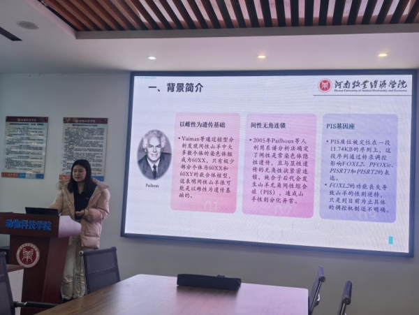 韩浩园博士的报告题目为《槐山羊间性发生机制和多胎性状关键基因挖掘》,通过核型鉴定、基因分型、高通量测序等方法研究鉴定出与山羊类固醇激素合成的相关基因,解析了槐山羊间性表型的发生分子基础;确定了与槐山羊产羔数相关的关键基因PRKAA1、CDH26和CD3D,并通过转录组测序方法筛选出12个与卵泡发育、激素合成与分泌相关的候选基因,为下一步的基因功能研究奠定了基础。