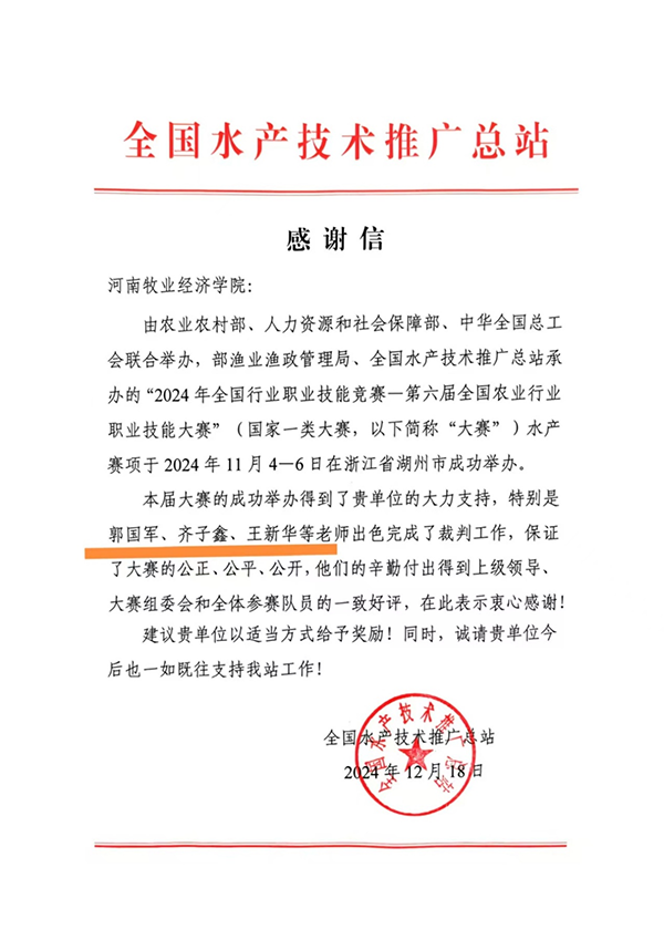 近日,全国水产技术推广总站发来感谢信,对公司水产养殖教研室教师、河南省科技特派员郭国军、齐子鑫、王新华等在2024年11月4-6日承担的“2024年全国行业职业技能竞赛—第六届全国农业行业职业技能大赛”(国家一类大赛)裁判工作表示感谢。