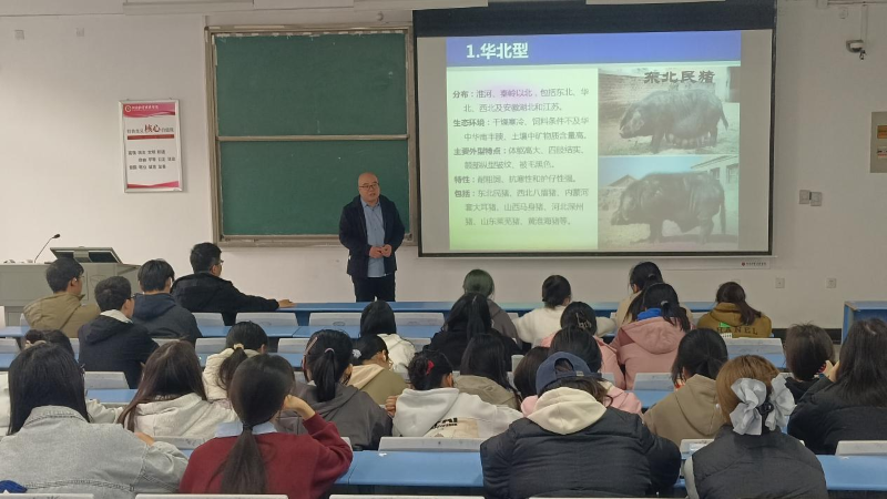 讲座中,赵广伟博士以“猪种资源的经济价值与保护实践”为主线,系统梳理了我国地方猪种的独特优势。从耐寒高产的东北民猪、繁殖力卓越的太湖猪,到肉质鲜美的金华猪,他结合实例阐释了不同猪种在农业经济、文化传承及民生保障中的重要作用。还特别分享了“南阳黑猪保护行动”为典型案例,生动还原了科研团队在种质资源保护中的攻坚历程。最后,他鼓励同学们关注前沿科技,积极参与企业实习,将理论与实践结合,才能成为行业亟需的复合型人才。