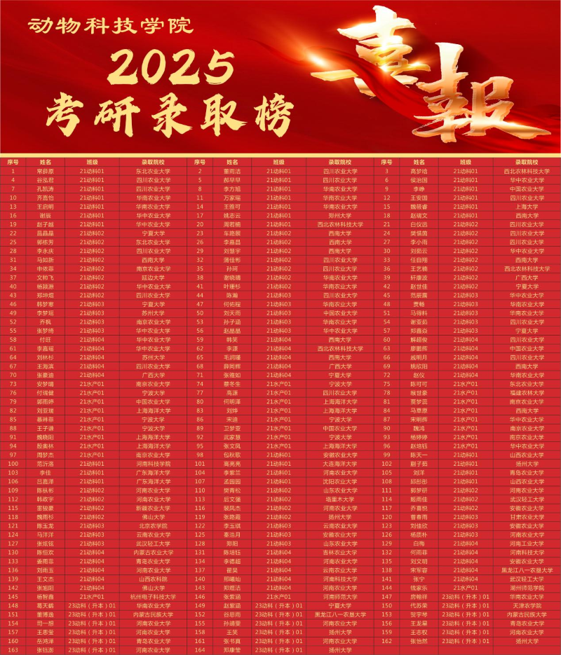 青春何惧逐风雨,我们都是追梦人。截至今日,公司2025届本科生升学人数达164人,其中100人被国家“985工程”重点建设高校、“211工程”重点建设高校、国家“双一流”建设高校录取,录取双一流及以上高校比例占比60.98%,录取高校质量有了进一步提升。21动科01、21动科02、21动科04、21水产01,4个班级录取率超50%,双一流及以上院校平均录取率超65%,是名副其实的学霸班级。
