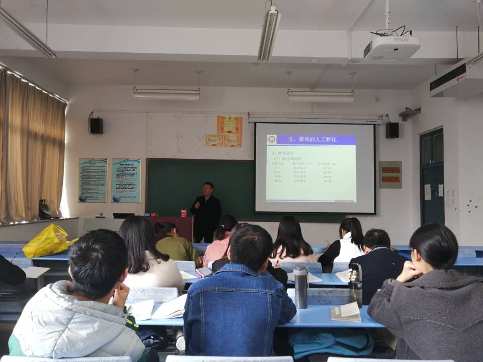 韩占兵老师此次研讨型观摩课授课课程为《特种经济禽类生产》,本堂课授课内容为“雉鸡的饲养管理”。韩老师首先对上节课的重点内容进行了回顾,进而引出本节课“雉鸡的饲养管理”在雉鸡生产中的地位和作用。接下来,韩老师从雉鸡育雏期、中雏期、育成期、繁殖期四个阶段详细讲解各阶段的饲养管理要点。在整个教学过程中韩老师理论结合实际,重点突出,既有不同阶段之间的重点分析,又有不同禽类之间的对照比较;既有理论讲解,又有图片展示。整个课程环节完整,备课充分,讲解流畅;教学针对性很强,师生互动良好,课堂氛围融洽,教学效果良好。观摩活动结束后,各位听课老师同韩老师一起就本科生教学的教学设计、授课方法、师生互动、教学内容等方面交流了自己的观点和看法,大家普遍认为韩老师备课充分,课堂实例来源于生产,注重员工能力培养,值得老师们学习。