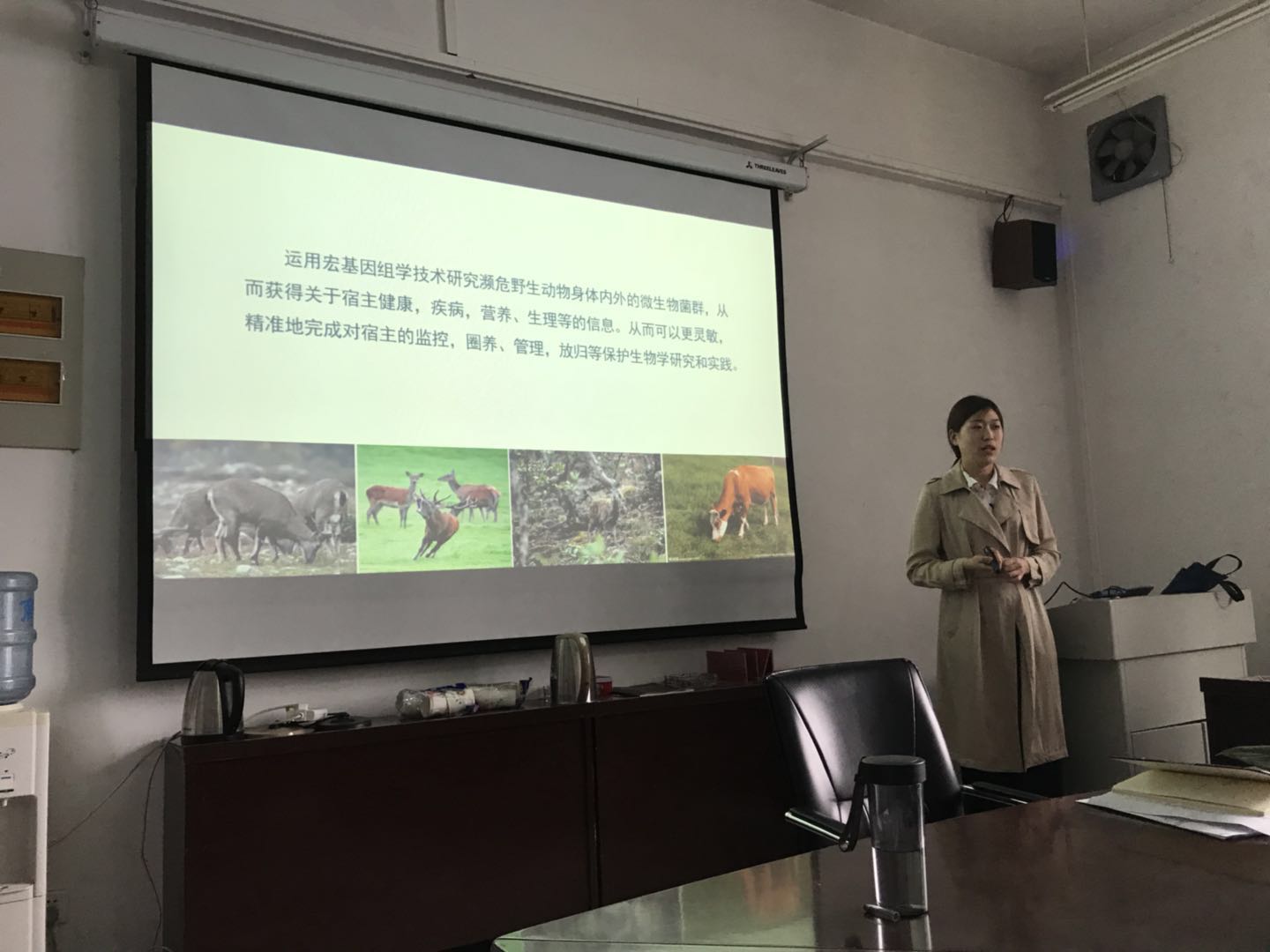报告会上,孙博士从课题背景、研究内容与研究方法、研究结果、讨论与展望四个方面进行了阐述,她先介绍了贺兰山马麝的基本情况,接着介绍利用从粪便中提取、挑选质量合格的DNA进行 16S rRNA和宏基因组测序,最后得出野外和圈养马麝肠道菌群结构、多样性、差异菌群和功能的分析。整个报告深入浅出、生动形象,使深奥的理论变得浅显易懂,娓娓道来,博得了老师们的阵阵掌声。报告结束后,与会教师就报告内容同孙博士进行了广泛的交流与探讨。