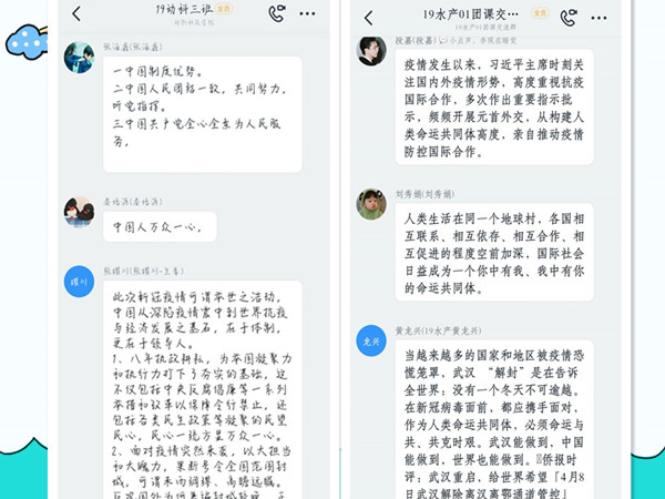 团课以共青团之歌拉开序幕,各班主讲人以主播的形式,将此次疫情期间各国面对疫情的态度与方式进行对比,深刻了解到中国对于疫情雷厉风行的态度以及我国防疫作业的优秀。与此同时,我们也看了习近平总书记开会期间的文录“疫情没有国界,世界各国是休戚与共的命运共同体”、“国际社会必须树立人类命运共同体意识,守望相助,携手应对风险挑战,共建美好地球家园”。人类命运共同体不是遥不可及的愿景,它是困难时刻领导人之间的坚定支持,是各国民众发自心底的爱心互动。大道至简,行久致远。一场席卷全球的公共卫生危机,更加凸显人类命运共同体理念的时代价值和现实意义。