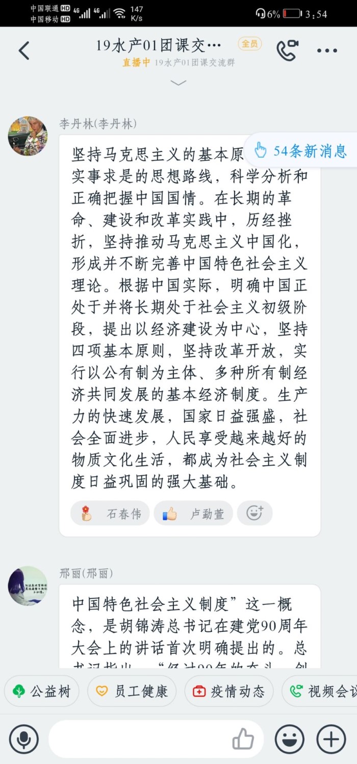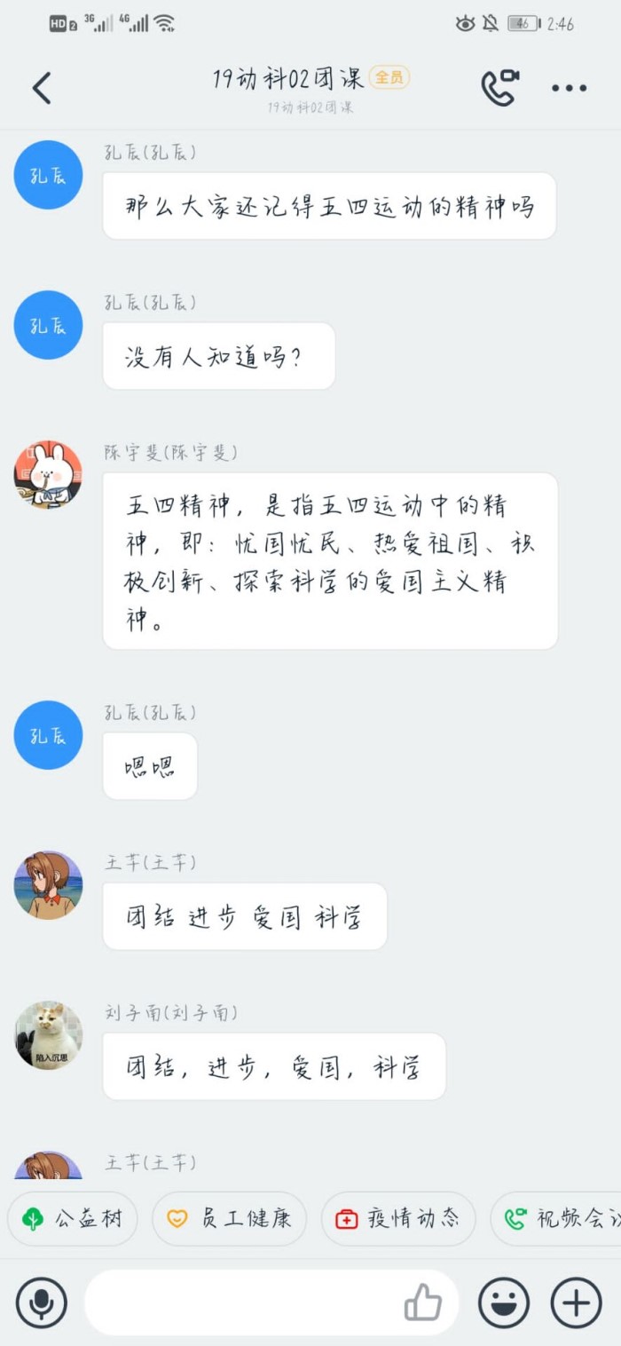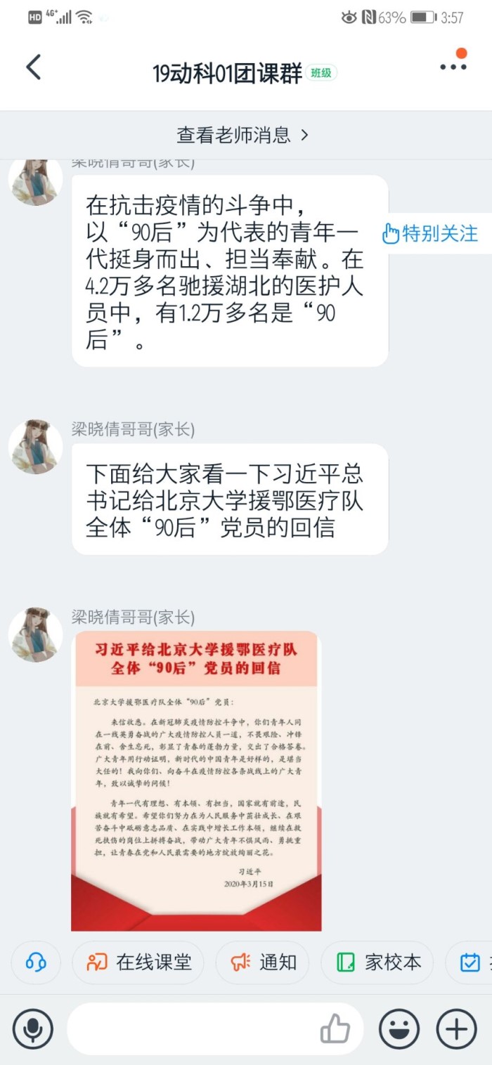 团课上全体青年团员共同学习与阅读习近平总书记给北京大学援鄂医疗队全体“90后”党员的回信。这字里行间都激励和引领着当代青年进一步坚定制度自信,在党和人民最需要的地方贡献力量,绽放青春。同学们也纷纷表示,向在一线英勇奋战的广大疫情防控人员学习,坚守岗位,不畏艰险、冲锋在前,彰显青春的蓬勃力量。哪有什么“岁月静好”,只不过是有人在为我们“负重前行”!主持人强调,我们更应该时刻铭记2020年,一个具有强大凝聚力的国家是无数幸福小家的坚强保障,越是这样的危难时刻,越能感知来自国家和民族的力量!