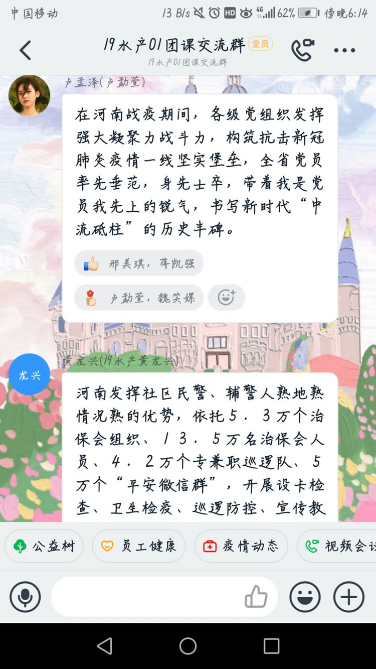 为纪念在此次疫情中拼搏在一线的中原儿女,高歌我中原儿女的所作所为,并且学习其中的时代精神。本周beats365官方网站进行了以“中原抗疫勇担当,众志成城铸雄关”为主题的团课活动。全体团员积极参加线上活动。