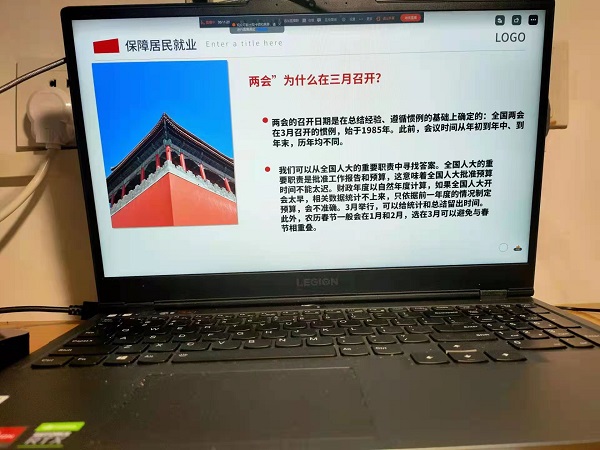 团课开始,各班主持人在钉钉群里播放共青团歌,并要求同学们在屏幕前进行跟唱。随后,主持人又为同学们详细介绍了3月5日在京举办的全国两会的主要内容,使同学们深刻理解党和国家事业之所以能取得具有里程碑意义的成就,根本原因在于有以习近平同志为核心的党中央掌舵领航,在于有习近平新时代中国特色社会主义思想作科学指引。最后,主持人随机连麦了多位同学,让同学们讲述这次团课的感悟以及对两会的认识。