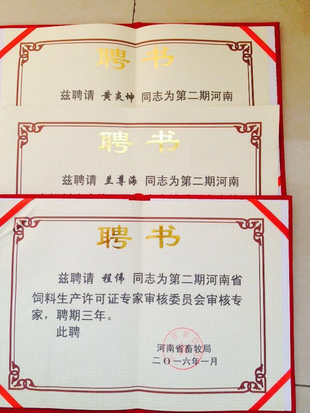 通过单位推荐、资格审核和培训考核,河南省畜牧局聘请公司黄炎坤、程伟和兰尊海三位教师为第二期河南省饲料生产许可证专家审核委员会专家,聘期三年。