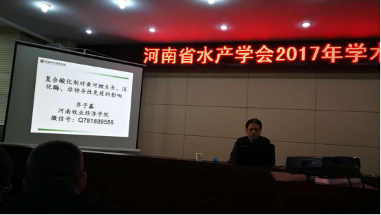 会议内容丰富、规格高,来自省内水产行业的主管部门、科研院所、高校和知名企业共40多家,特邀中科院水生生物研究所的鱼类遗传育种专家桂建芳院士、中国水产科学研究院东海水产研究所刘兴国研究员作报告。公司齐子鑫副教授在年会上作了关于“复合酸化剂对黄河鲤鱼的生长及免疫影响”的专题报告。会议期间两位教师积极与到会的专家、学者进行交流探讨,为公司水产专业在水产行业的影响摇旗呐喊,为河南省渔业发展提出独家建言。