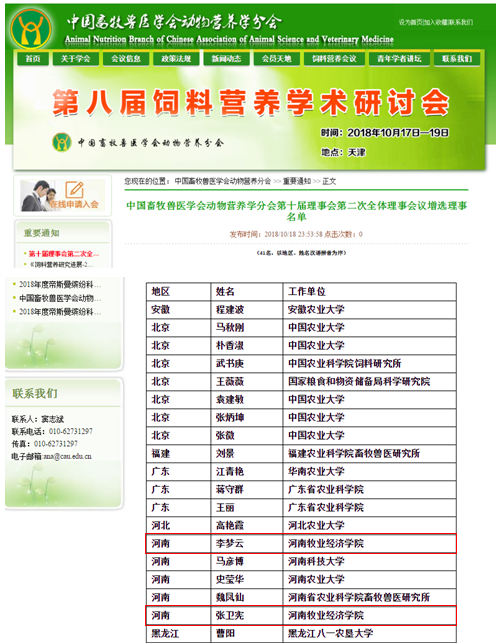 会议期间中国畜牧兽医学会动物营养学分会第十届理事会召开了第二次全体理事会,会议增选了41位新的理事,公司张卫宪教授、李梦云副教授当选理事。这也是公司专家首次被推选为该学会理事,对于加强与国内动物营养与饲料学科相关专家的交流、促进教学和科研合作、提升公司行业知名度将会发挥重要的促进作用。