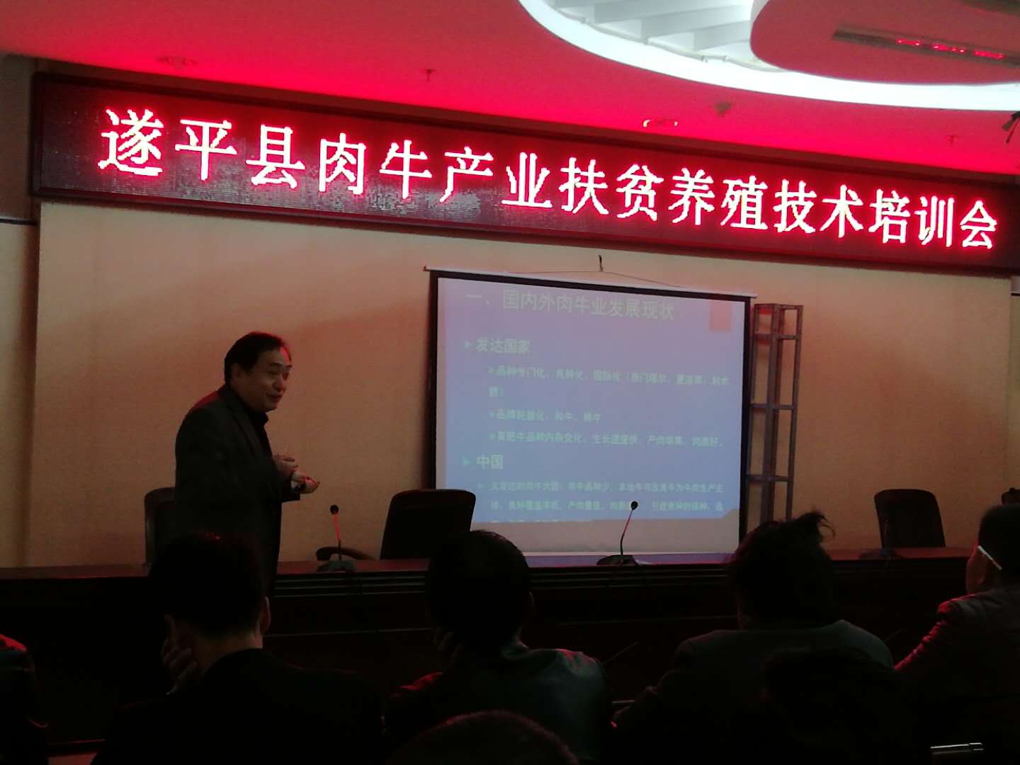 2018年10月21日,beats365官方网站教授级高工牛晖博士应遂平县畜牧局的邀请,对遂平县肉牛的饲养管理与疾病防控进行了技术培训,县畜牧局组织全县15个乡镇的120多个肉牛养殖场、养殖户,参会人数达140多人,这也是遂平县开展肉牛产业扶贫的一项主要内容。
