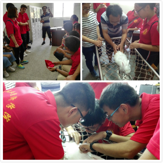 下午,队员们在华农员工干部的带领下来到动物医院进行动物针灸的实践教学活动。王德海老师首先向大家介绍了动物医院的接诊对象工作流程,这里不仅接诊常见的猫狗等小动物,同时也进行大动物的诊疗。队员们在王德海老师的带领下依次参观了化验室、影像室、手术室、住院部及针灸室。在动物医院走廊墙壁上,挂着许多宣传板,有动物的体表及穴位图,有猫狗等的解剖图,也有常见传染病的科普知识等,让同学们对动物穴位有了大致了解。然后王老师又带领大家来到了动物医院负一楼的住院部,这里分为普通病狗、传染病狗、猫三室。王老师利用问题引导员工思考、观察,又幽默风趣,同学们在欢快的氛围中对动物医院有了新的认识。基础知识普及后,王老师才带着大家进入到针灸室。王老师向大家科普了针灸的有关知识,并用真实案例向大家讲述了针灸的神奇疗效。为了使大家对针灸有进一步的认识,王老师详细地介绍了针灸的具体手法和实施步骤,用小白兔作为实验对象,为大家示范了针灸的具体操作。队员们都聚精会神的听着看着,摩拳擦掌,跃跃欲试。在王老师的鼓励下,所有的队员进行了针灸的实践操作,体验了一把中医的实践乐趣。