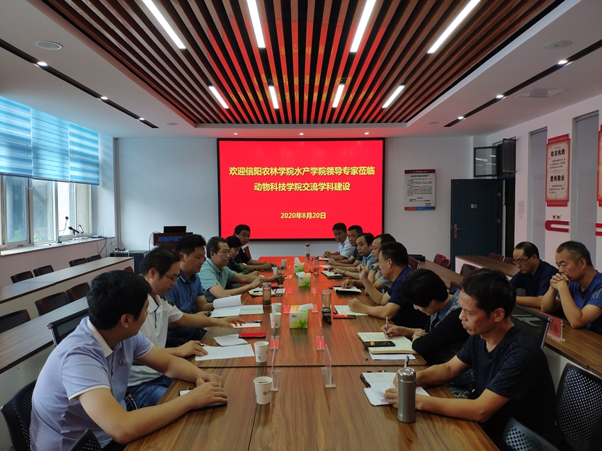 2020年8月21日,信阳农林公司水产公司书记郭旭升、经理杨东辉一行6人来公司考察交流本科合格评估和水产专业发展建设等工作。公司党委书记王建伟、经理席磊、副经理牛辉和水产养殖教研室全体老师参加了交流座谈会。