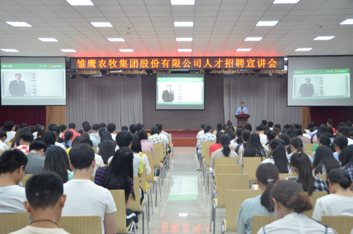 会议以企业宣传片切入正题,从视频中同学们了解到雏鹰是一家有梦想、致力于打造完整产业链、保证食物安全的现代化农牧企业。接下来杨超经理从就业方式、就业方向等几个方面分析了当前老员工的就业形势,阐述了畜牧业在我国的地位,并向同学们传达了“与其改变世界,不如先改变自己”的理念。最后杨经理表示雏鹰集团广纳贤士,向同学们介绍了集团晋升途径、优厚的薪资待遇、丰富多元的企业文化、及目前几个重要稀缺岗位信息。