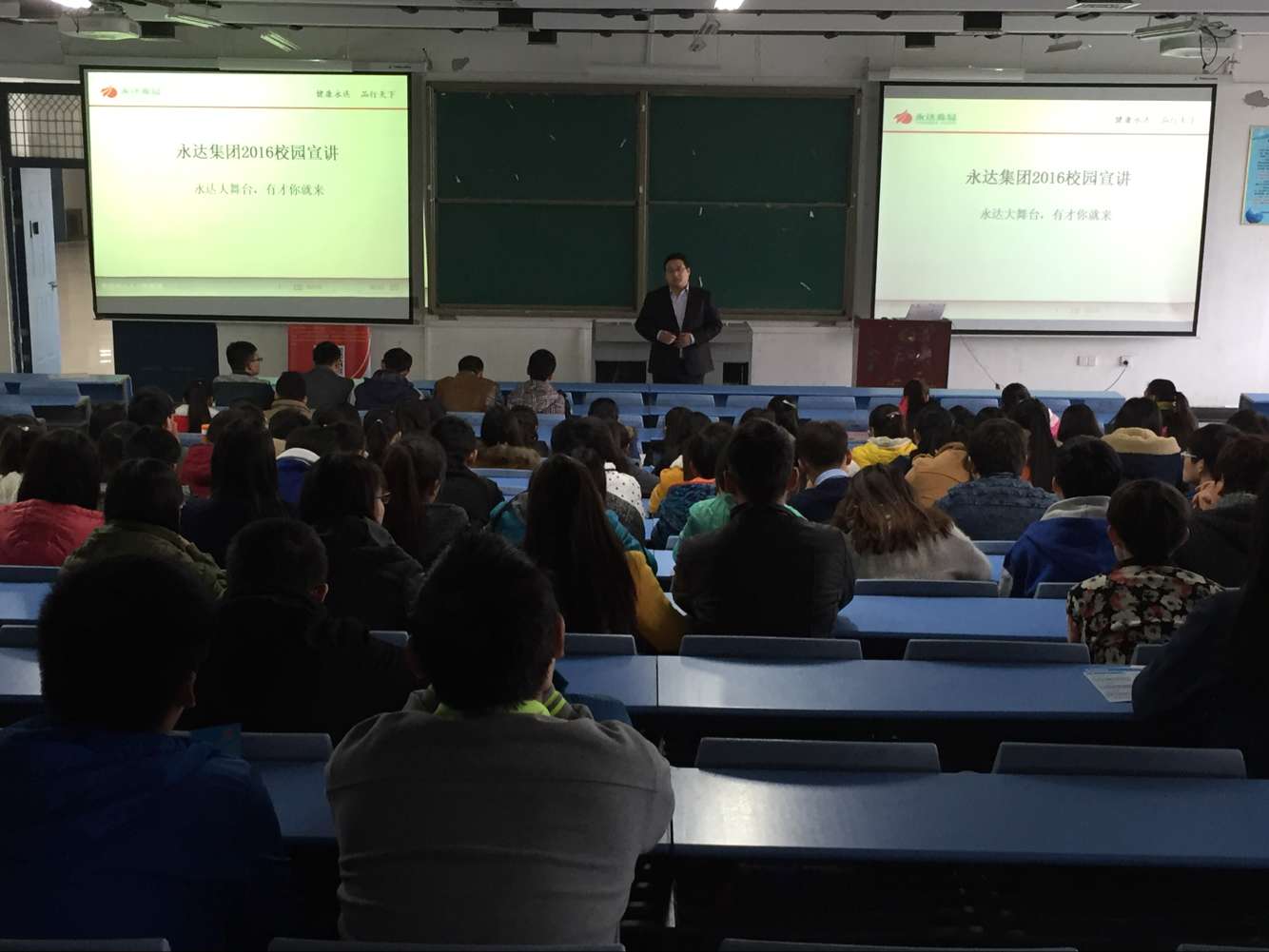为了更好地拓宽毕业生就业渠道,2015年11月12号14:30,公司在一号教学楼合400举办河南永达食业(集团)有限公司招聘会宣讲会,本次会议由永达集团刘经理主持,参会人员主要有13级、14级各班同学。