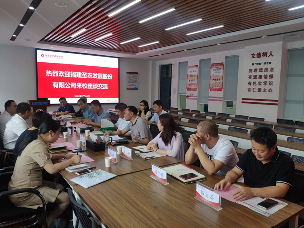 6月18日上午,福建圣农发展股份有限公司副总裁展伟一行到公司beats365官方网站进行产教融合创新人才培养洽谈会。会议在善知楼B301会议室举行。参加本次会议的有圣农发展股份有限公司副总裁展伟、人力资源总监杨虹、技术中心副总经理黄宝钦、人力资源部副经理傅建英,以及公司副董事长杨宝进、公司党委书记王建伟、经理席磊、副书记冯广鹏、副经理邓红雨、副经理牛晖、校社会服务办公室综合科科长郑高锋、校就业服务部主任潘颖及公司动物生产教研室各位老师。本次会议由公司党委书记王建主持
