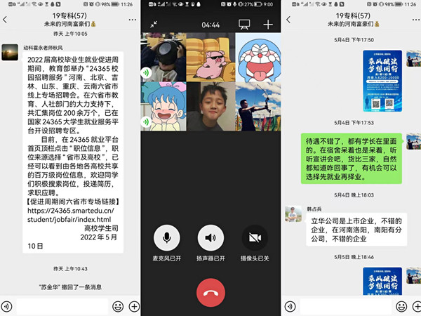 加大线上招聘力度。5月3日起公司暂停线下活动,就业活动全部改为线上。为积极做好线上招聘工作,努力实现毕业生充分就业,在公司领导的统一指导下,充分利用好网络平台,挖掘网络资源,收集招聘信息,组织开展线上招聘,保证就业服务工作不间断。公司领导和公司就业专干同产教战略联盟企业及重点紧密企业用人单位保持紧密联系,广泛收集用人单位招聘信息,通过微信公众号、公司官网以及微信、QQ班级群等多种形式每日一期,坚持高频度、密集化和针对性推送,同时针对企业的用人需求定期举办线上宣讲会,丰富的就业招聘信息为毕业生就业提供了更多的选择。