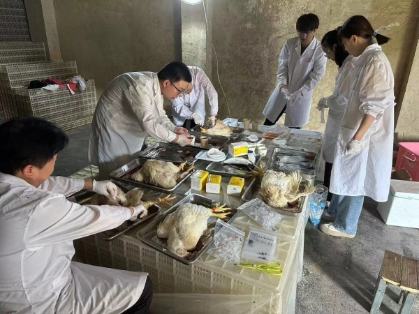在前期工作的基础上,19日,郭良兴三人带领6名动物科学专业的实习生完成了采样试管、抗凝管、离心管等编号准备工作,开展了对肉鸡和肉种鸡的粪便等采样工作,抽样待解剖肉鸡。20日,师生们进行了称重、采血,取心脏、肺脏、肝脏、脾脏、肾脏、法氏囊、腺胃和肌胃以及十二指肠、空肠和回肠各一厘米固定,采集盲肠粪便等等。期间,同学们均实现了独立完成采样工作,熟练掌握采样各环节技术,心里特别高兴。
