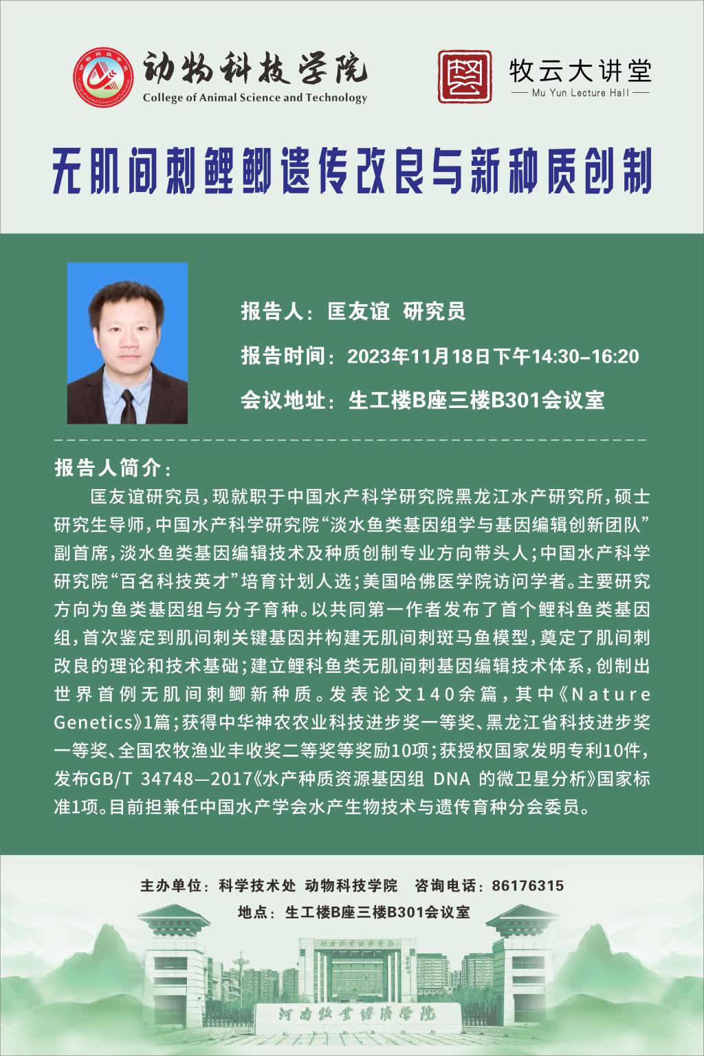 海报——“牧云大讲堂”第三十五场专题报告会《无肌间刺鲤鲫遗传改良与新种质创制》