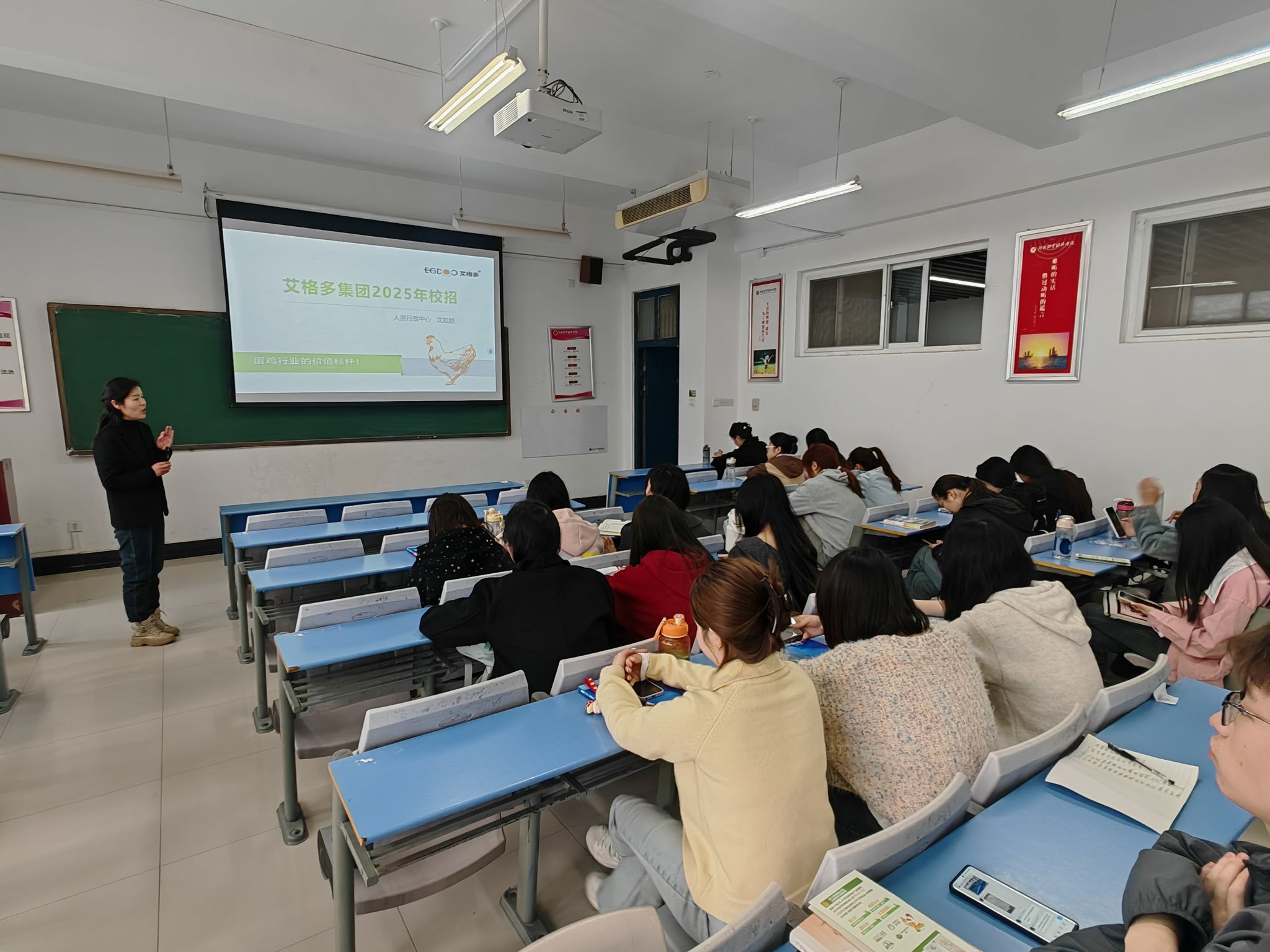 宣讲会现场,艾格多集团通过企业宣传片、高管宣讲等形式,向学子们生动展示了蛋鸡行业的发展前景与技术创新成果。集团人力资源总监指出:“中国农业正迈向智能化、规模化,我们需要更多年轻力量加入。河南、辽宁两大生产基地已为新人准备好实战舞台。”