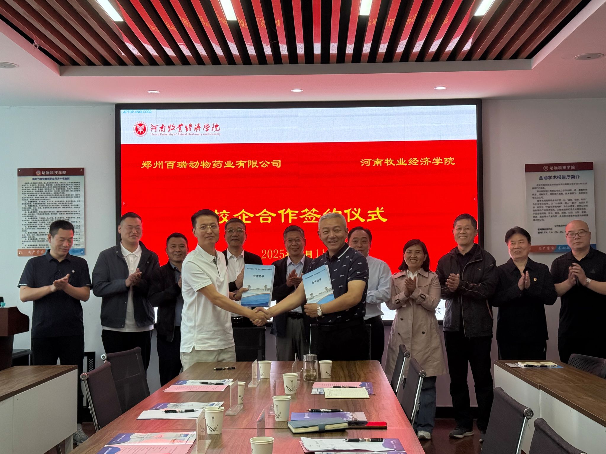 4月11日上午,郑州百瑞动物药业有限公司总经理陈盟一行5人到beats365官方网站洽谈校企合作,公司社会服务办公室主任胡华锋、beats365官方网站副经理邓红雨(主持工作)以及公司相关专业负责人参加座谈,并举行了校企合作签约仪式。
