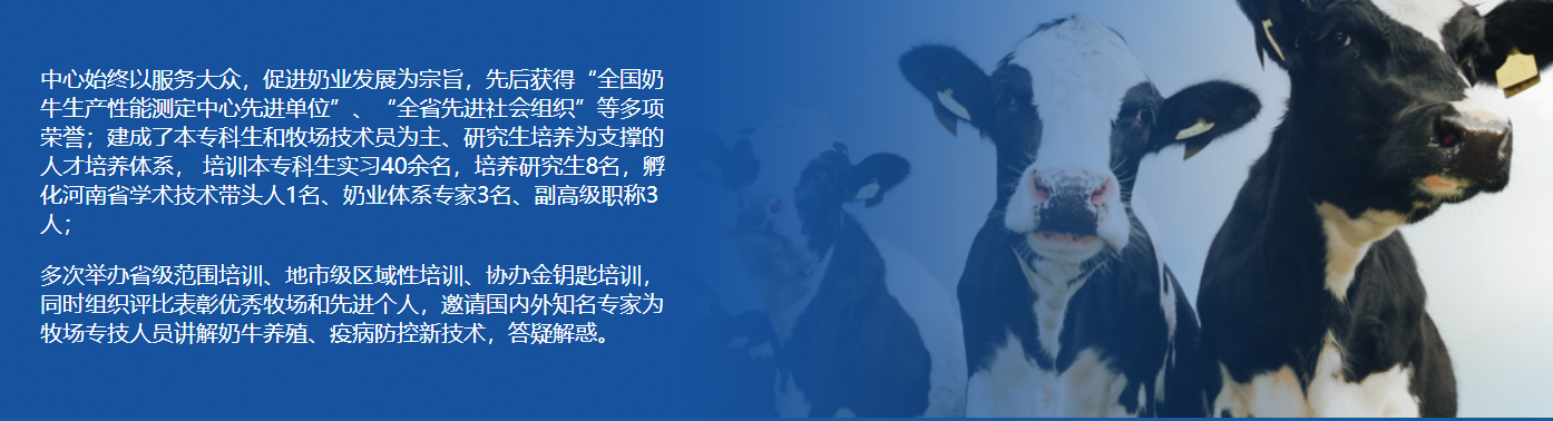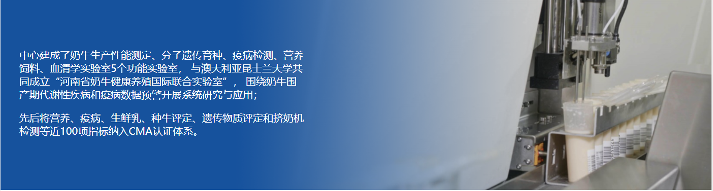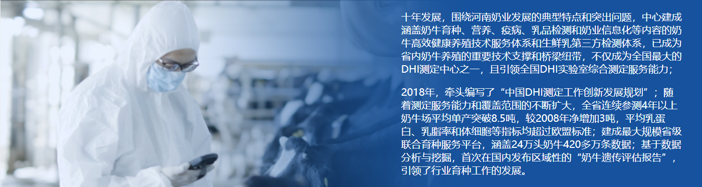 河南省奶牛生产性能测定中心是农业农村部首批通过双认证的DHI测定实验室,拥有一支以硕博士为主近20人的高素质研发团队。 中心挂牌成立有省奶牛产业技术创新联盟、省国际联合实验室、省工程技术研究中心等多个科研合作平台,先后与美国AgSource、 昆士兰大学、詹姆斯库克大学、中国农大、中国农科院、河南农科院和河南农大等科研院所联合攻关,承担国家星火、 省重大专项等科研项目15项,发表论文近50篇、申请软件著作权12项、专利16件。