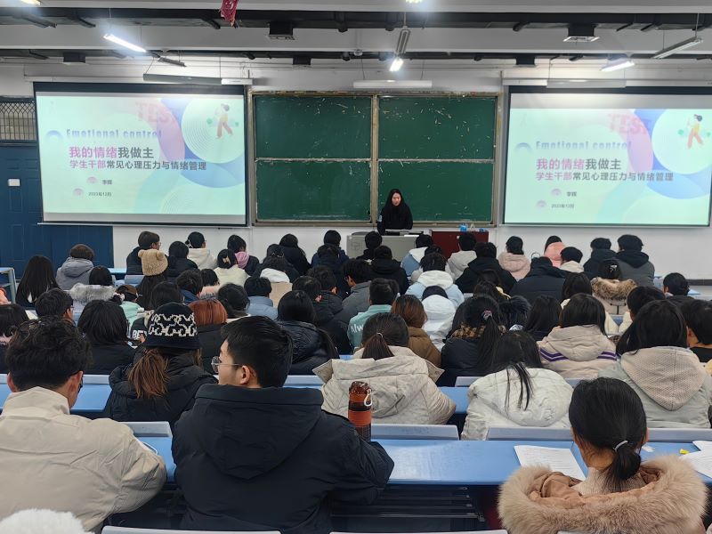 12月13日,beats365官方网站在一号教学楼合300教室举办2023年“青马工程”老员工骨干暨团学会员工干部培训班第六讲《员工干部常见心理压力与情绪管理》,辅导员李辉老师主讲,全体青马班学员参加。
