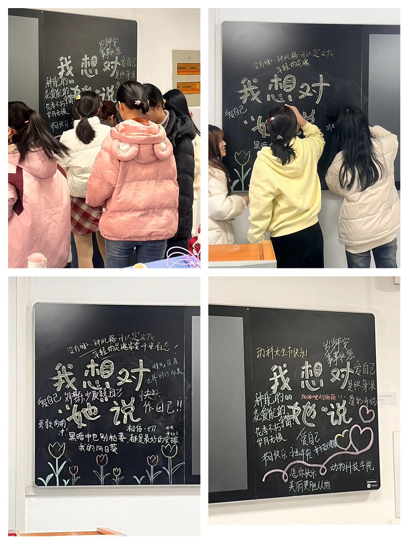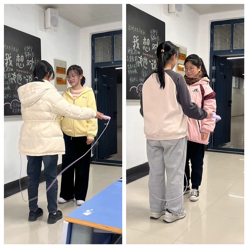 本次活动分为“我想对她说”“寻找心搭档”“快乐健步走”三项。在“我想对她说”环节,女生们在黑板上写下心中对“她”的祝福与期许,一句句话语凝聚着大家的真情实感,承载着对女生的深情厚意,传递着温暖与美好;在“寻找心搭档”环节,箱子中装有代表颜色的纸条,参与的同学需从箱子中抽取纸条,并寻找身上带有纸条颜色元素的女生,两人共同完成双人跳绳;“快乐健步走”环节,女生们按照规定路线,迈着整齐的步伐,昂首阔步、精神饱满,围绕校园环走一圈,在运动中增进了交流、加深了感情、愉悦了心情,一路欢声笑语,现场其乐融融。